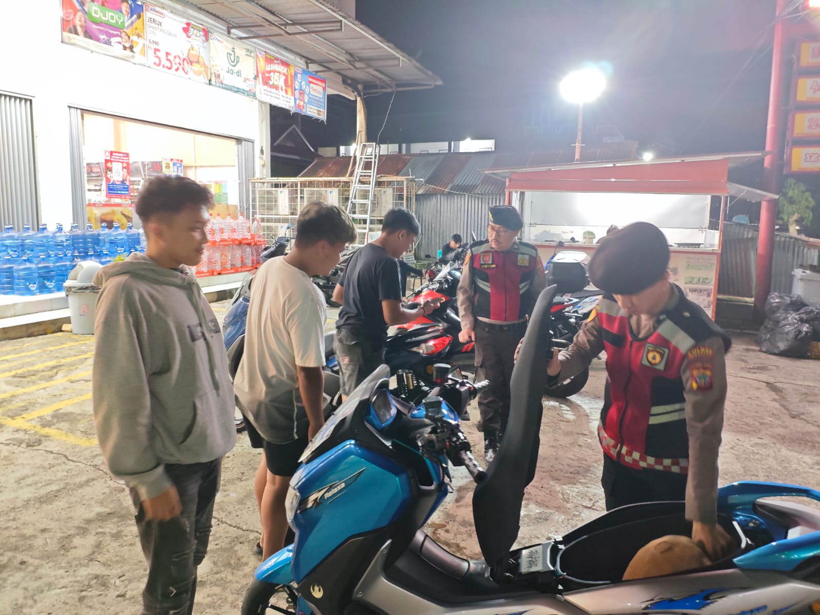 Di sejumlah gerai ritel modern seperti Indomaret dan Alfamidi, petugas melakukan pemeriksaan terhadap pengendara roda dua serta barang bawaan masyarakat yang masih beraktivitas. Dengan pendekatan humanis namun tegas, personel memastikan tidak terdapat senjata tajam maupun barang terlarang lainnya yang berpotensi memicu gangguan keamanan.