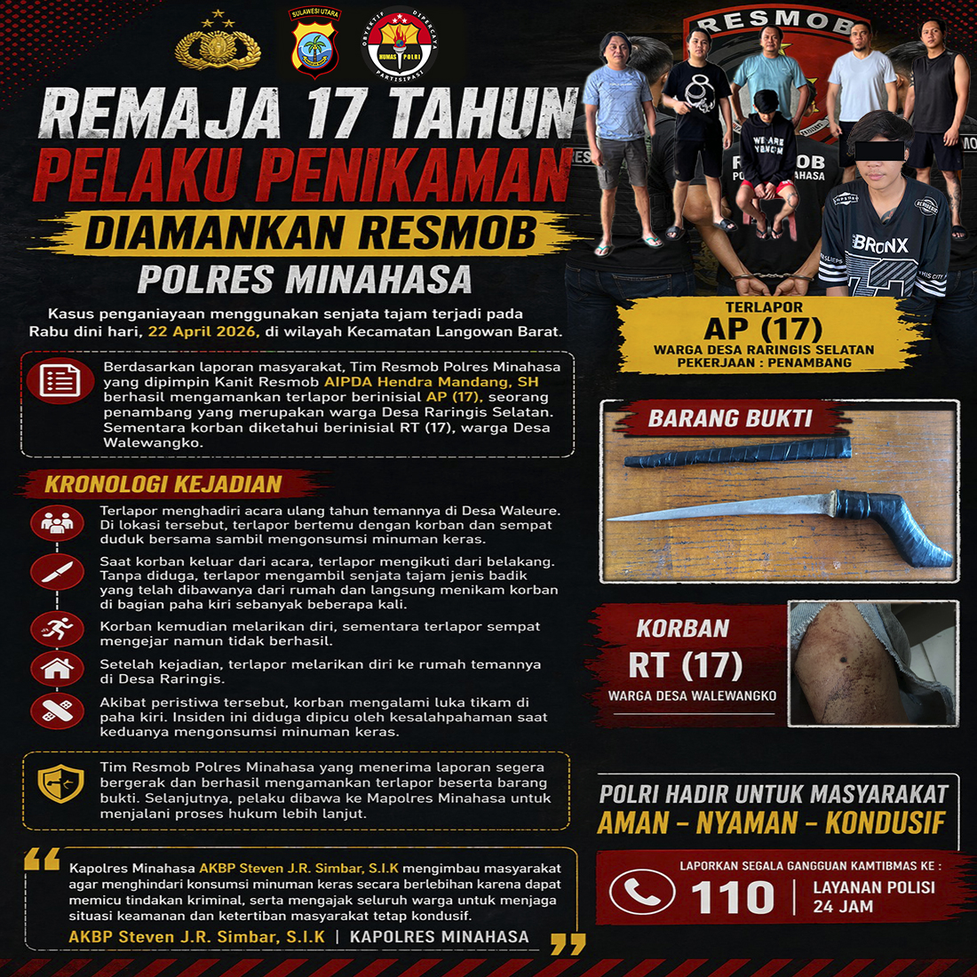 Kapolres Minahasa AKBP Steven J.R. Simbar, S.I.K mengimbau masyarakat agar menghindari konsumsi minuman keras secara berlebihan karena dapat memicu tindakan kriminal, serta mengajak seluruh warga untuk menjaga situasi keamanan dan ketertiban masyarakat tetap kondusif.