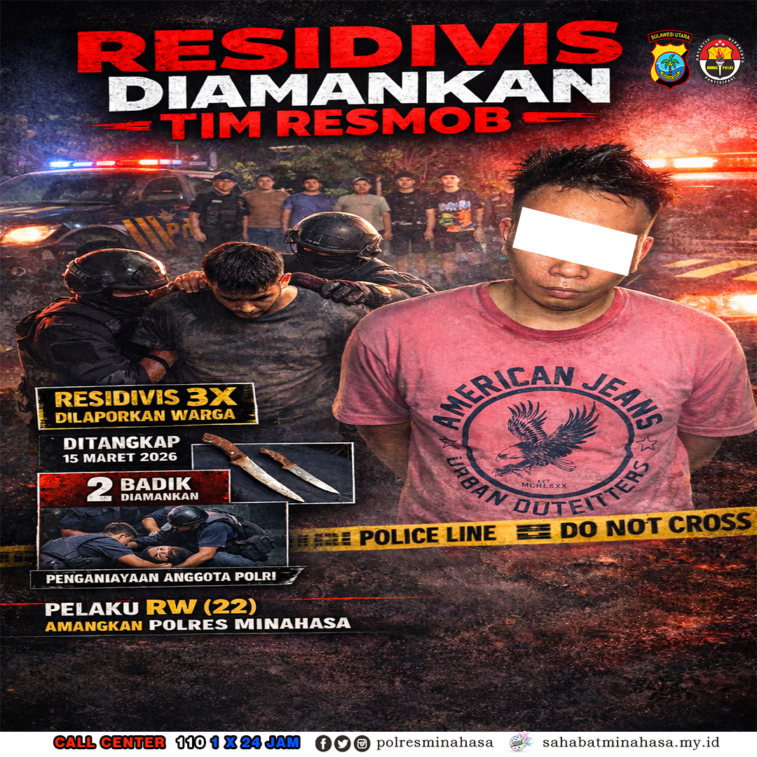 Pelaku diketahui bernama Rian Walelang (22), warga Perum SBY II Kecamatan Airmadidi. Ia diamankan setelah diketahui merupakan residivis yang telah tiga kali dilaporkan oleh masyarakat dalam kasus yang berbeda, yakni kasus penganiayaan, pengrusakan dan pengancaman, serta pengrusakan dan pencurian.