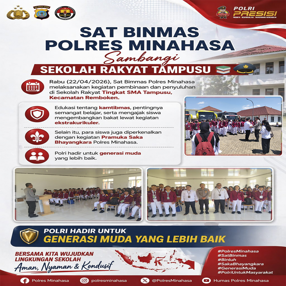 MINAHASA – Dalam rangka meningkatkan kesadaran hukum dan menjaga situasi kamtibmas di kalangan pelajar, Satuan Binmas Polres Minahasa melaksanakan kegiatan Pembinaan dan Penyuluhan (Binluh) di Sekolah Rakyat Tingkat SMA Tampusu, Kecamatan Remboken, Rabu (22/04/2026) pukul 09.30 Wita.