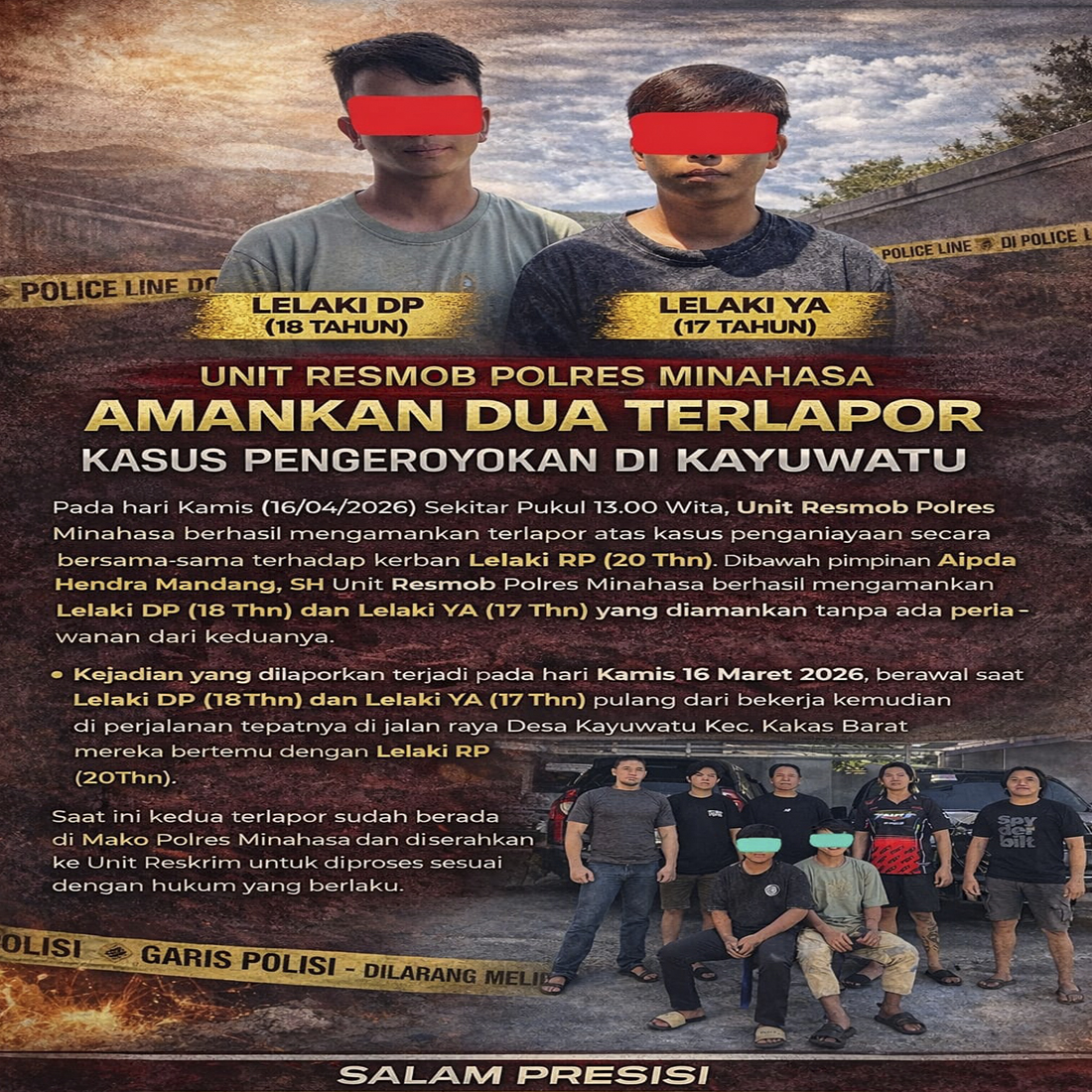 Pada hari Kamis (16/042026) Sekitar Pukul 13.00 Wita, Unit Resmob Polres Minahasa berhasil mengamankan terlapor atas kasus penganiayaan secara bersama-sama terhadap korban Lelaki RP (20 Thn). Dibawah pimpinan Aipda Hendra Mandang, SH Unit Resmob Polres Minahasa berhasil mengamankan kedua terlapor diantaranya Lelaki DP (18 Thn) dan Lelaki YA (17 Thn) yang diamankan tanpa ada perlawanan dari keduanya.